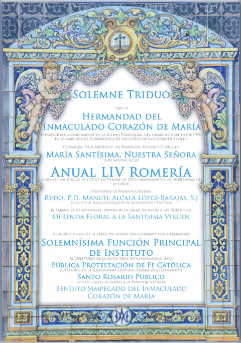 Durante los días 26, 27 y 28 de Septiembre de 2012 a las 20.00 horas de la tarde, tendrá lugar en la Parroquia del Inmaculado Corazón de María los Solemnes Triduos en honor a Nuestra Titular.